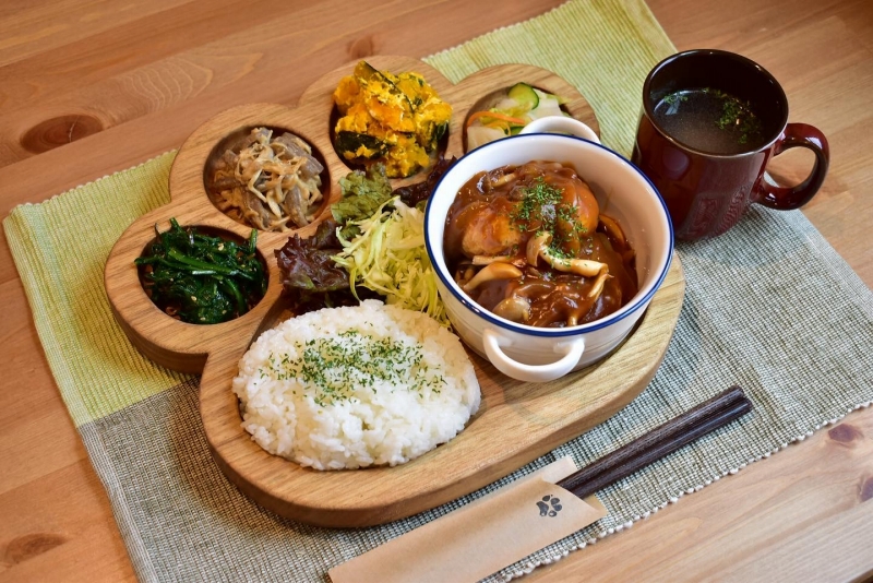 一番人気のメニューは、多彩な味わいが肉球型のプレートに盛り付けられた「週替わりプレート(1,000円 税込)」。また、週末限定の「大人のお子様プレート(1,000円 税込)」など、地域の食材をふんだんに活かした料理は食べ応えも満点です!