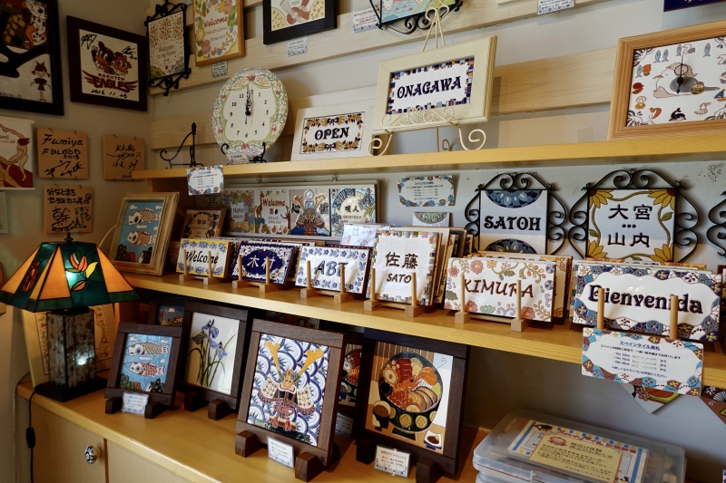 工房内には所狭しとたくさんのスペインタイルが並んでいます。コースター(1,760円 税込)やマグネット(990円 税込)、女性に好評のアロマタイル(990円 税込)といった小物はお土産にぴったりで「近頃はアマビエのコースターも人気ですね」と阿部さん。表札や季節のイベントにあわせたプレートはギフトなどにも最適です。