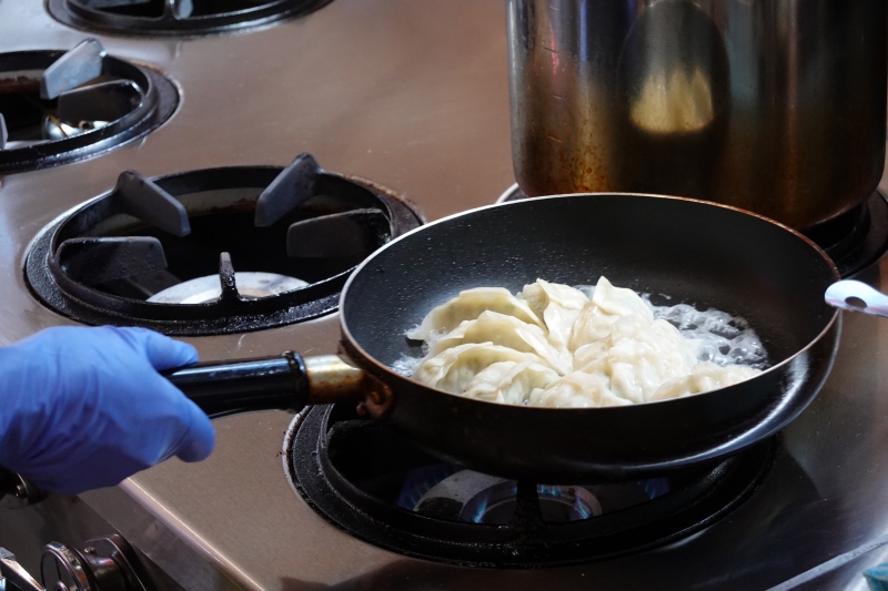 こうして作られた餃子を、はちやでは「揚げ焼き」に。餃子をフライパンで蒸し焼きにした後、国産の米油とオリーブオイルをオリジナルブレンドした、たっぷりの油を使って焼き上げます。これによって外側はカリッと、中はジューシーな食感に仕上がります。