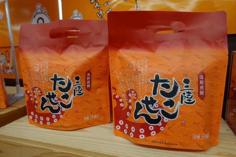 せんべいはどれも創業当初からの製法や調味料にこだわっており、三陸の原料もたくさん使われています。一番人気のせんべいは、オレンジ色のパッケージが目を引く「三陸たこせん」(648円)。