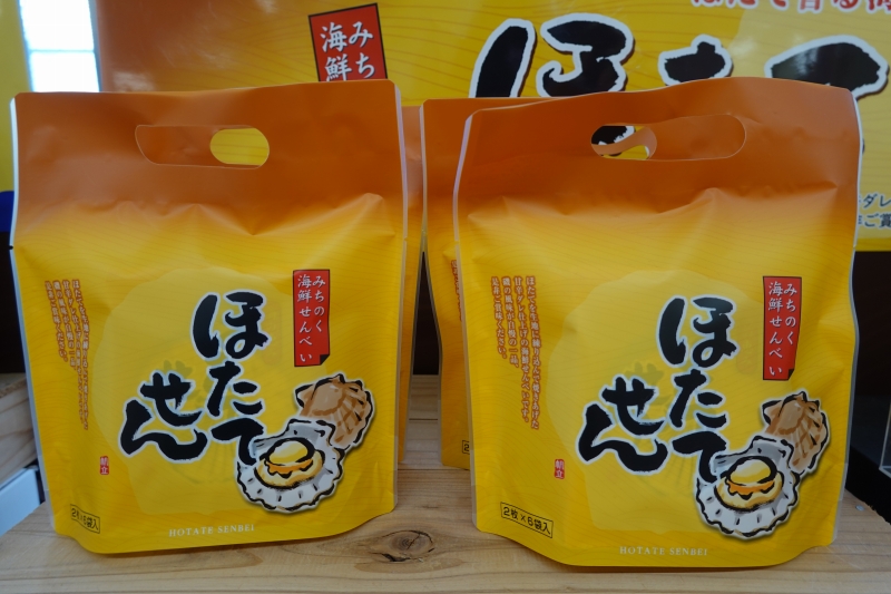 その他にも、ほたてせんべいやわかめせんべいなどのせんべいが豊富に揃い、お土産にぴったり。また、店内では海鮮お好み焼きの「海鮮塩竈焼き」(300円)、「イカの姿焼き」(600円)といった軽食も販売しており、小腹が空いた時におすすめです。