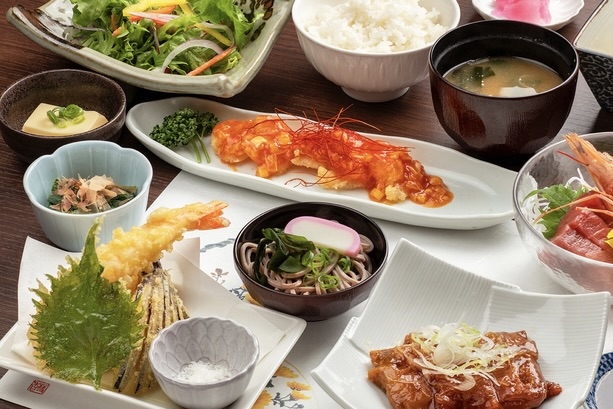 惣菜やお弁当などのテイクアウトのほかに、店内でランチや軽食をいただくことができます。一番人気は、その日の惣菜が詰め合わせられる「9種のお総菜定食」(1,100円)。その他にも「月替わりカレープレート」(1,100円)、「生姜香る唐揚げ定食」(759円)なども人気。また、「カツ丼定食」(870円)、「天丼定食」(820円)といったボリューム満点のメニューも充実しており、東松島市の多彩なおいしさに出会うことができます。
