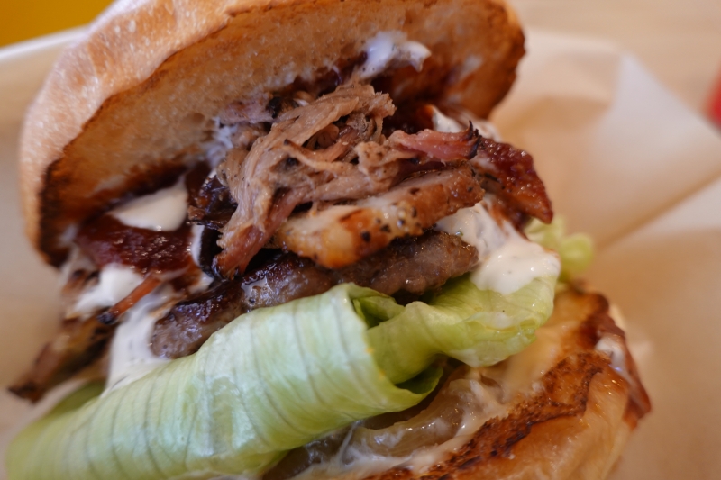 看板メニューの「イーストコーストバーガー」(2,100円)は、パティのほかにプルドポークや燻製されたベーコンなどが入っており、さまざまなおいしさを一度に楽しむことができます。