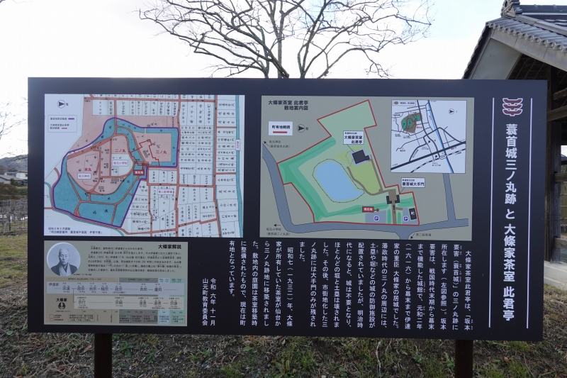 拝領当時、茶室は仙台市川内地区の大條家屋敷内に建築されましたが、1888年の屋敷移転に伴い同市内の支倉地区へ移築。その後、1932年に大條家の拠点であった「坂本要害三ノ丸跡」へ移築され、現在に至ります。敷地内には、藩政時代に要害だったことを思わせる蓑首城(みのくびじょう)大手門の骨組みも残されています。