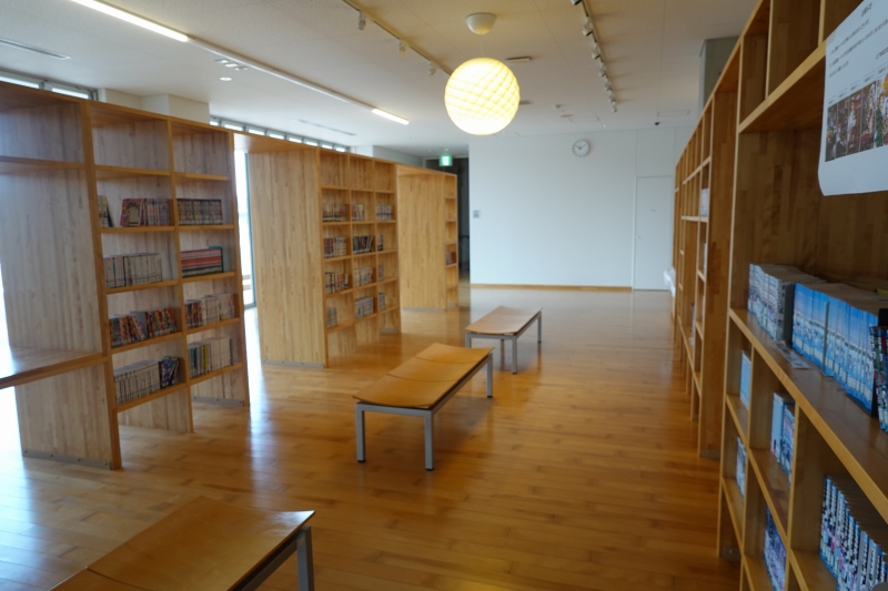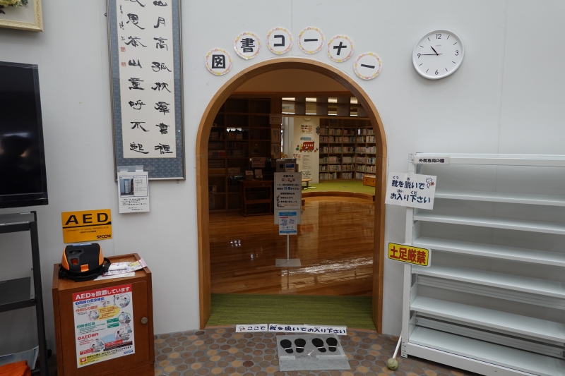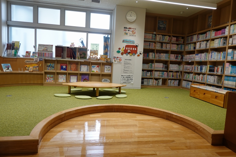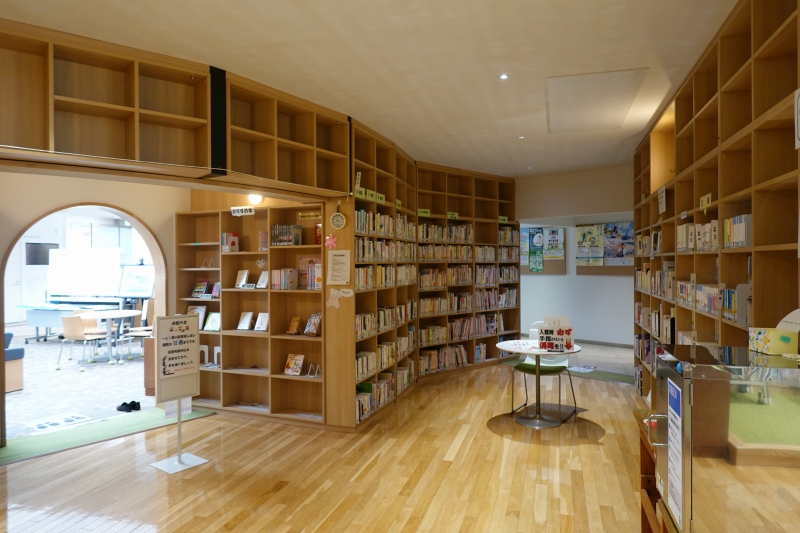 また壁一面に本棚が並ぶ図書コーナーもあり、奥にはカーペット敷きのスペースが設けられるなど、子どもから高齢者までゆったりと過ごせる工夫がなされています。